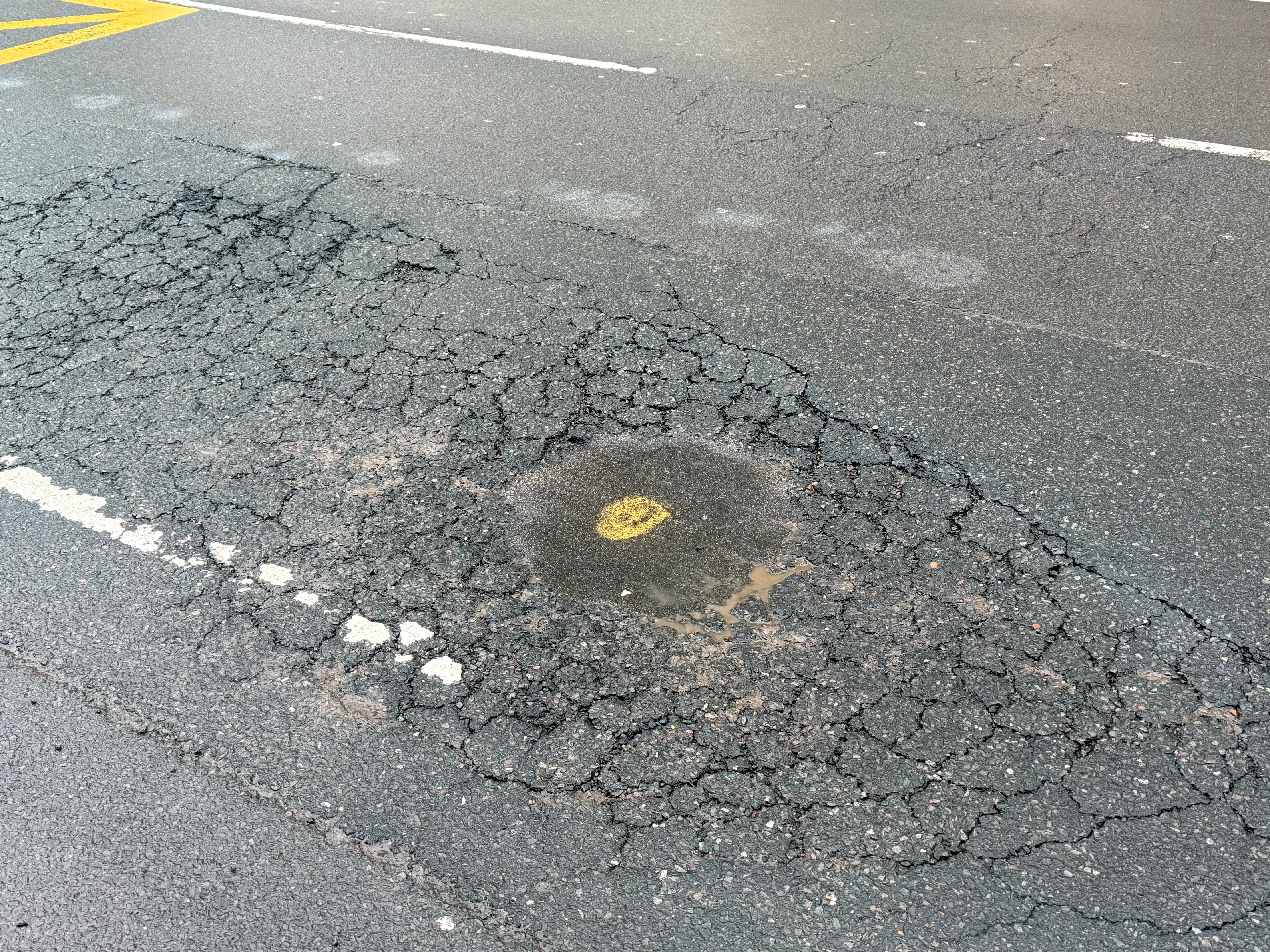Once inspected, the pothole is marked with spray paint: