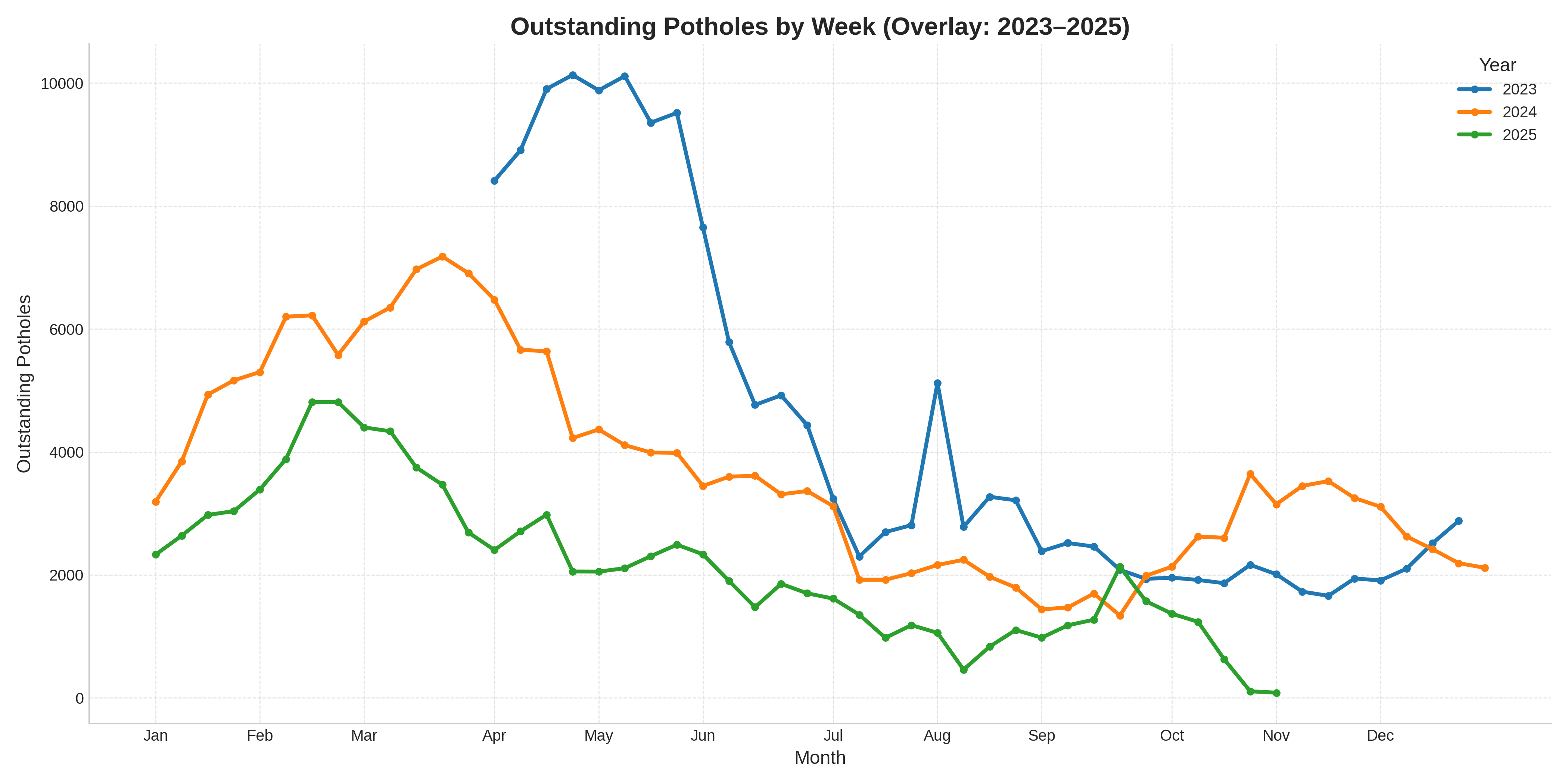 Weekly totals of potholes reported, outstanding, and completed
