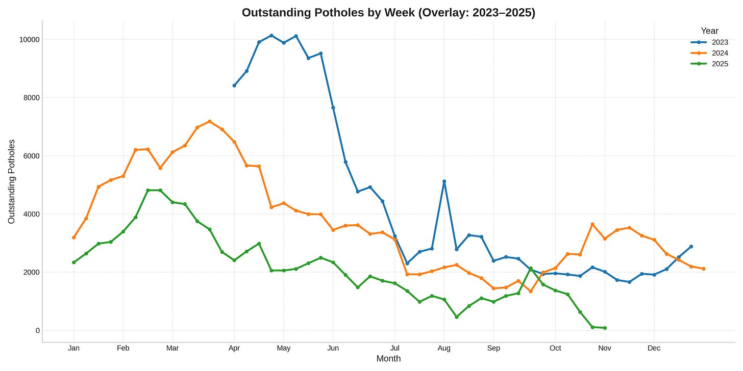 Any public complaint also triggers a reinspection. While the number of poor-quality repairs is small, they’re highly visible, so we take them seriously. If you see a bad repair, please do tell us. Repairing ~50,000 potholes a year in all conditions means they’re not all perfect, but where there’s substandard work we can and do hold our contractor accountable.